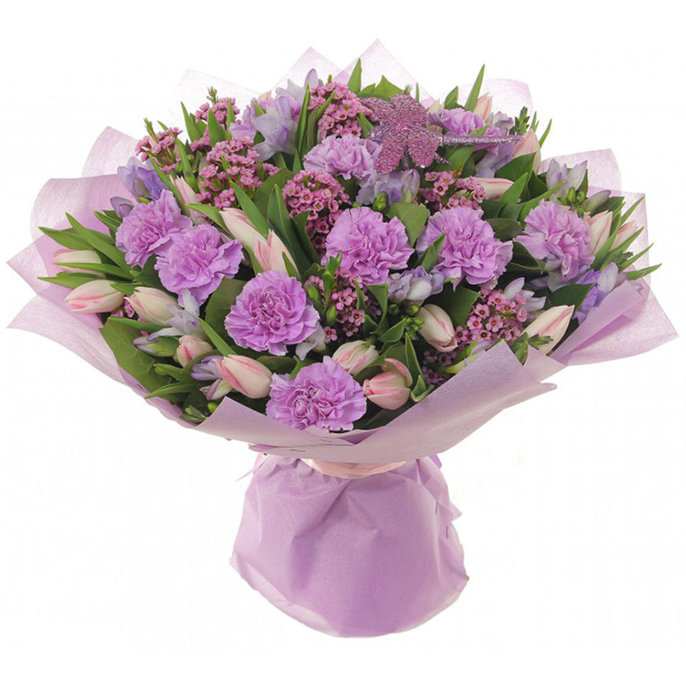 Гвоздика, тюльпаны, хамелациум, экзотическая зелень.